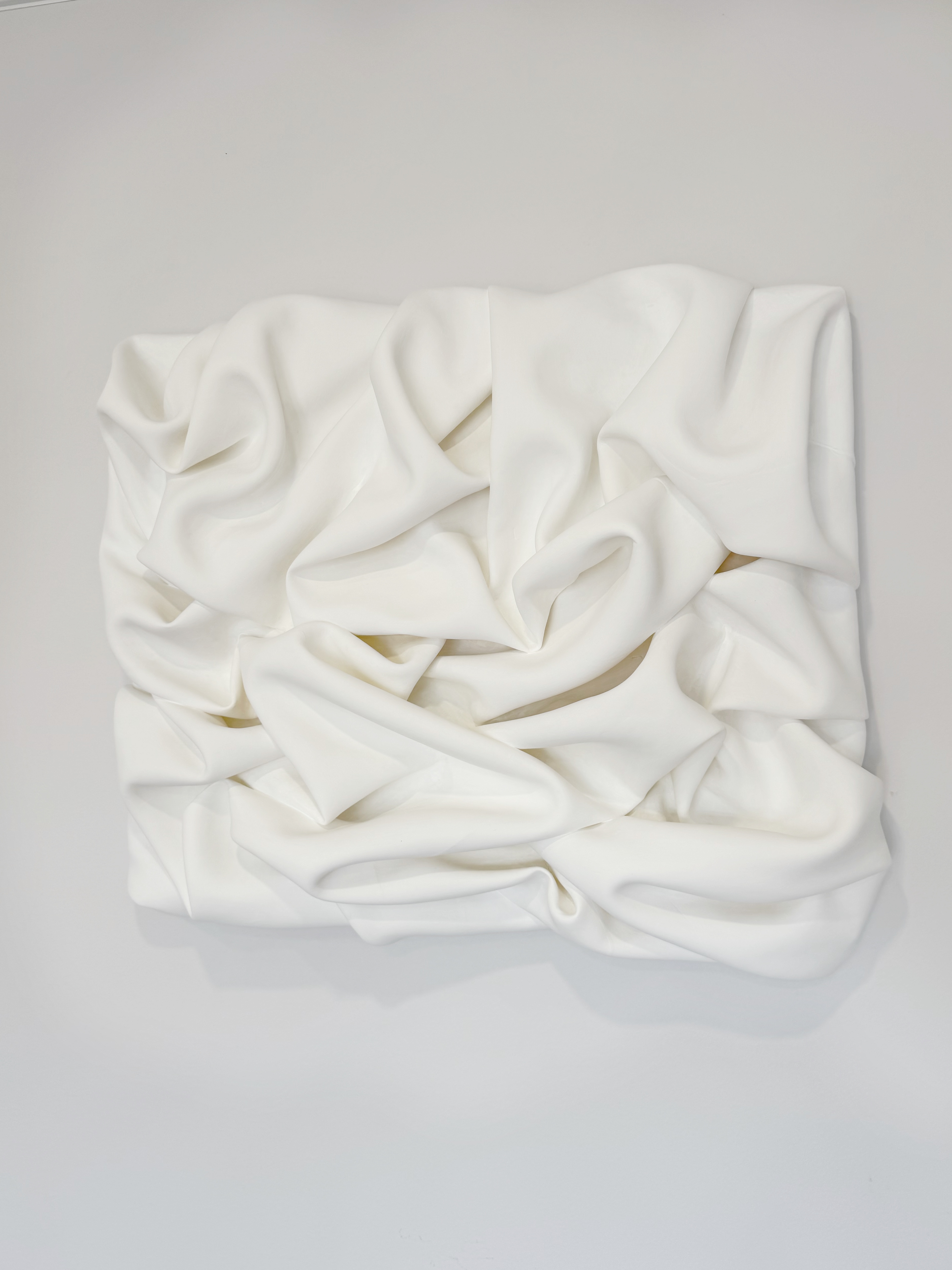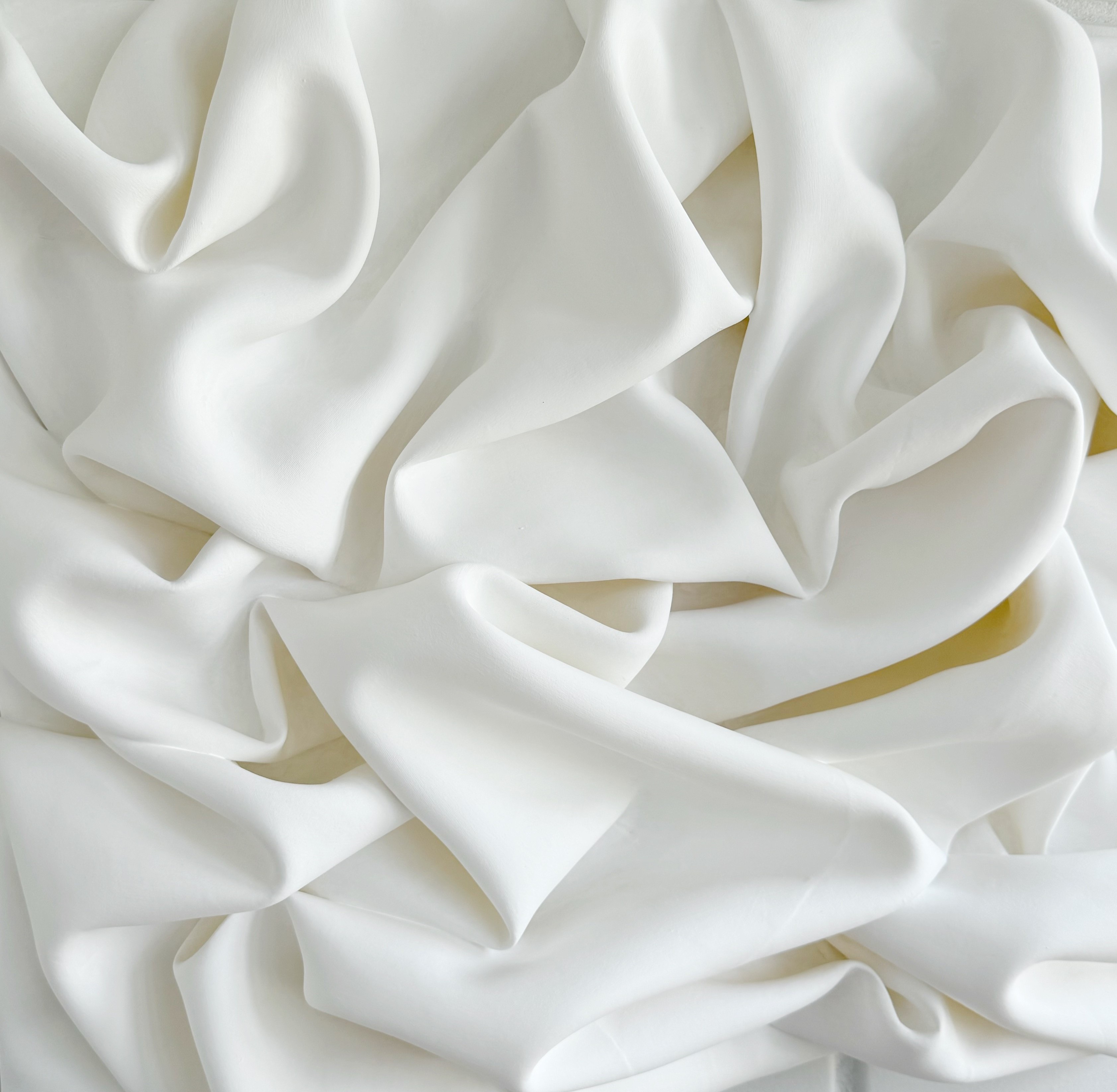 Панно «Объем» создано из ткани и гипса на деревянном планшете. Но, несмотря на это, визуально оно лёгкое и воздушное. Идеально впишется в спокойный натуральный интерьер.